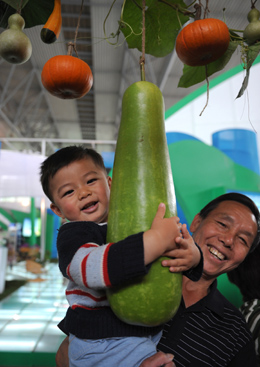 9月4日,小朋友抱著大大的瓜果留影。2008年中國昆明國際花卉展暨昆明國際農(nóng)業(yè)博覽會正在召開,極富特色的無公害、綠色食品亮相,如重達一百公斤的南瓜、造型特異的絲瓜、精美的辣椒等都受到市民的喜愛。