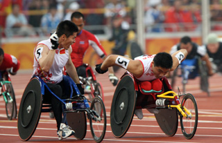 9月9日,中國選手張立新(左)與隊友李虎召在比賽中交接。當日,在國家體育場進行的北京2008年殘奧會男子4X100米接力T53/T54級決賽中,中國隊以49秒90的成績奪冠。