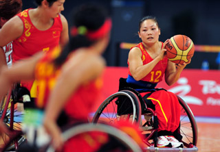 9月9日,中國隊球員劉咪換(右一)在比賽中控球。當日,在國家體育館舉行的北京2008年殘奧會輪椅籃球女子B組預(yù)賽中,中國隊以53比37戰(zhàn)勝墨西哥隊。