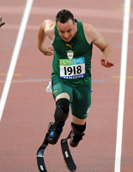 9月9日,南非選手皮斯托瑞斯在比賽中沖過終點。當日,在國家體育場進行的北京2008年殘奧會男子100米T44級決賽中,有“刀鋒戰(zhàn)士”之稱的南非著名殘疾人運動員皮斯托瑞斯以11秒17的成績奪得冠軍。