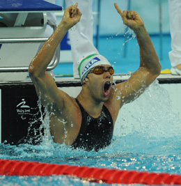 9月9日,巴西選手布拉西爾在獲勝后慶祝。當日,在北京2008年殘奧會S10級男子100米自由泳決賽中,巴西選手安德烈·布拉西爾以51秒38的成績打破世界紀錄并獲得冠軍。