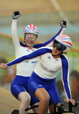 9月9日,英國選手麥格林(左)和領(lǐng)騎員亨特在比賽后慶祝勝利。當日,在老山自行車館舉行的北京2008年殘奧會場地自行車女子個人追逐賽(B&VI)中,麥格林和亨特以3分39秒809的成績奪得冠軍。
