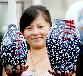 在淮北市舉辦的景德鎮(zhèn)瓷器展上,造型圖案別致的“青花紐扣”等瓷器吸引了觀眾的目光。