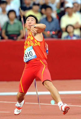 9月10日,中國選手朱鵬凱在比賽中。當(dāng)日,在國家體育場進(jìn)行的北京2008年殘奧會男子標(biāo)槍F11/12級決賽中,朱鵬凱以63米07的成績奪冠,并打破世界紀(jì)錄。
