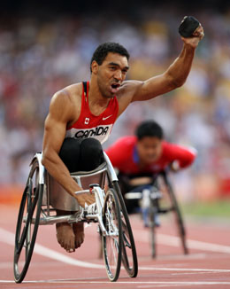 9月10日,加拿大選手伯杰龍?jiān)跊_過終點(diǎn)后慶祝。當(dāng)日,在北京2008年殘奧會男子200米T52級決賽中,伯杰龍以30秒81的成績奪冠。