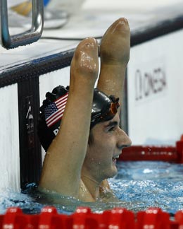 9月10日,美國選手羅伊·佩金斯在獲勝后慶祝。當(dāng)日,在北京2008年殘奧會S5級男子50米蝶泳決賽中,美國選手羅伊·佩金斯以35秒95的成績獲得冠軍并打破世界紀(jì)錄。