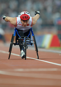 攝 | “我天生就喜歡速度的感覺,那種在奔跑中風(fēng)從耳邊掠過的快感……” 雖然不幸因病截去了一條腿,但以輪椅為“戰(zhàn)車”的張立新,終于在北京殘奧會(huì)上實(shí)現(xiàn)了他從小的追風(fēng)夢(mèng)想。 14日晚6點(diǎn)半,鳥巢。男子4X400米T53-54級(jí)輪椅競(jìng)速接力賽,中國(guó)四員“飛車虎將”張立新、崔彥鋒、趙驥、李虎召以3分5秒67奪得冠軍,并且刷新了由他們?cè)谏衔鐒倓倓?chuàng)造的世界紀(jì)錄。當(dāng)最后一棒的張立新像風(fēng)一樣刮到終點(diǎn)時(shí),他已經(jīng)超出第二名足足有四十米遠(yuǎn)。 這是張立新第四次“站”在最高領(lǐng)獎(jiǎng)臺(tái)上,注視著國(guó)旗從眼前升起。在他參加的集體和單人共4個(gè)項(xiàng)目比賽中,全部摘下金牌! “他太讓人難以置信了,在賽場(chǎng)上他簡(jiǎn)直就是‘野獸’!边@是在14日男子200米T54級(jí)決賽后,和他同場(chǎng)競(jìng)技的前殘奧會(huì)冠軍、芬蘭名將泰赫蒂對(duì)張立新的評(píng)價(jià)。 能取得今天的驕人成績(jī),張立新在賽后最想感謝的人除了媽媽外,就是他的恩師——前國(guó)家輪椅競(jìng)速隊(duì)總教練田海江!斑@個(gè)月30號(hào)是田導(dǎo)去世一周年的日子,如果時(shí)間安排允許,我想去他的老家湖北武漢祭奠一下。田導(dǎo)生前最大的愿望就是在北京奧運(yùn)會(huì)上帶著我們奪取金牌! “他直到臨走動(dòng)手術(shù)前還在給我們寫訓(xùn)練計(jì)劃!比ツ陚鋺(zhàn)全國(guó)殘運(yùn)會(huì)的時(shí)候,田海江被查出胰腺癌晚期,三個(gè)月后過世。 帶著幫恩師實(shí)現(xiàn)遺愿的雄心,在本屆殘奧會(huì)上,張立新一次次地帶給大家驚喜!霸瓉硐肽玫揭粔K金牌就很高興了,沒想到越戰(zhàn)越勇。” 8日上午,北京殘奧會(huì)田徑比賽在“鳥巢”揭幕,張立新在男子400米T54級(jí)第一輪的比賽中,就打破殘奧會(huì)紀(jì)錄。 9日,張立新和隊(duì)友合力獲得男子4X100米接力T53-54級(jí)金牌。 10日,在男子400米T54級(jí)的決賽中,張立新一路領(lǐng)先斬獲冠軍,同時(shí)以45秒07的成績(jī)創(chuàng)造了新的世界紀(jì)錄。 14日上午,男子200米T54級(jí)決賽中,張立新以24秒34的成績(jī)奪冠。他在預(yù)賽中以24秒18的成績(jī)創(chuàng)下了新的世界紀(jì)錄。 14日晚上,男子4X400米接力T53-54級(jí)決賽,張立新和三名隊(duì)友用金牌和破世界紀(jì)錄的成績(jī)?yōu)樽约旱谋本垔W之旅完美收官。 身高1米80,長(zhǎng)得陽(yáng)光帥氣的張立新從小喜歡運(yùn)動(dòng),在學(xué)校時(shí)是校足球隊(duì)的主力前鋒。后來,因?yàn)楣侨饬霾坏貌唤厝ヒ粭l腿,但這并沒有毀掉張立新的體育之路。此后,張立新打過一段時(shí)間的輪椅籃球,但當(dāng)他第一次看到輪椅競(jìng)速比賽時(shí),場(chǎng)上風(fēng)馳電掣的場(chǎng)面再次點(diǎn)燃了他心中的追風(fēng)夢(mèng)想。 輪椅競(jìng)速的訓(xùn)練枯燥、艱苦。張立新介紹說,輪椅的操控主要來自雙手的快速摩擦,就算是戴著皮手套,同樣會(huì)帶來?yè)p傷。在賽后接受采訪時(shí),張立新把雙手伸到記者面前說:“你們看,兩只手都練得變型了,骨節(jié)都比較大。” 同時(shí),運(yùn)動(dòng)員參加比賽所用的輪椅并不好控制,“我們的重心都在后面,控制不好就會(huì)側(cè)翻,尤其是在下雨的時(shí)候!睆埩⑿戮驮谝淮斡(xùn)練中因?yàn)閭?cè)翻而摔成腦震蕩!爸钡浆F(xiàn)在,累的時(shí)候還會(huì)有點(diǎn)頭疼,”他說。 雖然付出了巨大的努力,但張立新成長(zhǎng)的道路也并非一帆風(fēng)順。四年前的雅典殘奧會(huì),張立新僅僅獲得一個(gè)第六名。 從雅典的第六到北京殘奧會(huì)獲得四金,張立新付出了太多的努力。這里面也包含了田海江教練的精心調(diào)教!八牢覀儦埣踩诉\(yùn)動(dòng)員需要什么,也知道怎么管理和訓(xùn)練我們,這是他最獨(dú)特的地方! 梅花香自苦寒來。日復(fù)一日的苦練,讓張立新逐漸躋身世界頂級(jí)選手的行列。他和隊(duì)友一起,獲得了世錦賽、亞運(yùn)會(huì)的冠軍,但他最希望的,還是能在北京奪冠。 張立新最終實(shí)現(xiàn)了他的夢(mèng)想,他的下一個(gè)目標(biāo)在四年后的倫敦。