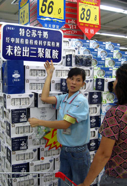 9月24日,在?谀吵校膳ED掏瞥鰞(yōu)惠活動(dòng),并標(biāo)出牛奶不含三聚氰胺的標(biāo)志。目前,蒙牛、伊利等奶制品商家都在?谑懈鞔蟪匈N出公告,承諾目前所售產(chǎn)品已通過檢驗(yàn),市民可放心飲用。鑒于消費(fèi)者對(duì)商品的信心還有待恢復(fù),部分商家積極開展了各類促銷活動(dòng)。