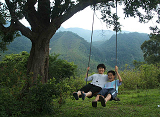 參加“探險游”的一對母子在海南鸚歌嶺山腳下蕩秋千。新華社發(fā)(彭桐
