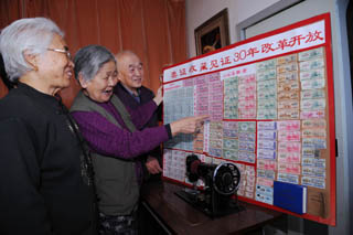 董化銘老人指著展板上的各類票證回憶起往事:“在那個(gè)年代,不僅人們收入微薄,而且物資匱乏,一切東西全部都要憑票證,實(shí)行計(jì)劃供應(yīng)! 各類票證充斥著人們的生活,糧票、肉票、布票、鹽票、油票、煙票、……就連買糖果、糕點(diǎn)、火柴、肥皂也要憑票,票證漸漸成了城鄉(xiāng)居民吃飽穿暖的一種保障。一個(gè)家庭所有生活必需品都離不開(kāi)各種票證,在當(dāng)時(shí)誰(shuí)家要是把票證丟失了,就意味著這個(gè)月可能沒(méi)有肉吃沒(méi)有衣穿了。 一個(gè)好的當(dāng)家人不僅要計(jì)算著每月幾十元工資如何養(yǎng)活一家數(shù)口人,還要精打細(xì)算精心管理如何使用一個(gè)月內(nèi)各種票證,每人每月供應(yīng)三兩油,根本就不夠吃,每日飯菜很少吃到油香味,所以家里買肉時(shí)都挑肥的。當(dāng)年的米面約0.15元一斤,豬肉約0.74元一斤,都得憑票購(gòu)買,那時(shí)候的人們都是‘等米下鍋’,只等票兒一到手,迫不及待就要去買米,沒(méi)有票,人們拿錢也買不到這些東西。老人說(shuō),家里至今仍保存著的一臺(tái)燕牌縫紉機(jī)就是憑當(dāng)年的票證買的。 董化銘老人還告訴記者:“之所以現(xiàn)在還能留下這么多糧票,并不是因?yàn)楫?dāng)年家里富余吃不完,而是因?yàn)檫^(guò)去糧食少,經(jīng)常有票也買不上,所以這些糧票才會(huì)剩在手里!