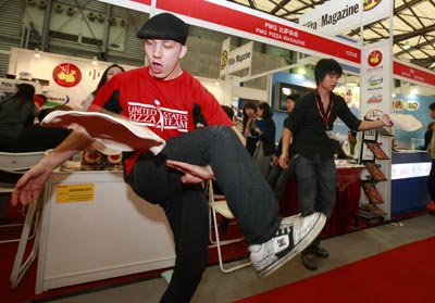 12月4日,2008中國國際食品及酒店設(shè)備用品博覽會在上海新國際博覽中心開幕,來自美國、英國、日本、新加坡等25個國家和地區(qū)的近750家食品企業(yè)參展。本屆展會的展出面積達8000平方米,展出了各國風(fēng)味的食品、飲料,參觀者在大飽眼福的同時也能免費品嘗各種美味。圖為一名廚師正在展會現(xiàn)場制作比薩。