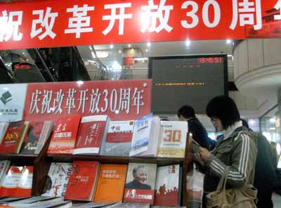 12月7日,讀者在北京圖書大廈一層“慶祝改革開放30周年”專柜前挑選圖書。近日,為慶祝我國改革開放30周年,北京圖書大廈設立“慶祝改革開放30周年”圖書專柜,集中展示幾十部有關中國改革開放30周年的書籍,涉及政治、經(jīng)濟、社科等,吸引許多讀者選購。
