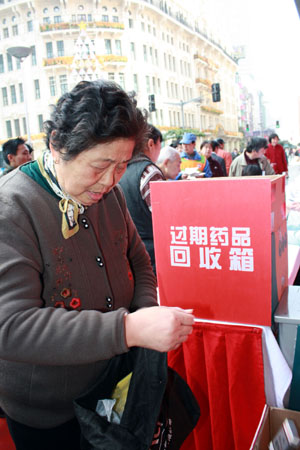12月9日,市民把過期藥品投入南京路上設(shè)立的“過期藥品回收箱”。