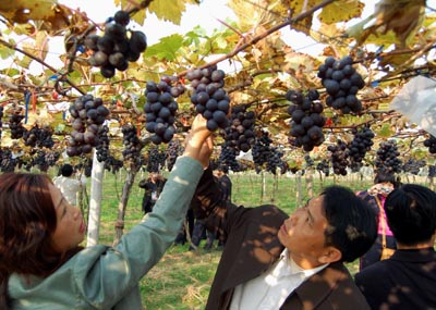 幾位游客在南寧吳圩明陽(yáng)雙季葡萄種植采摘。(攝于12月18日)近年來(lái),廣西通過(guò)推廣避雨、避寒、避曬“三避”技術(shù)以及蓋膜避雨技術(shù),破解了葡萄種植在高溫多濕天氣下易生病的難題,實(shí)現(xiàn)葡萄種植一年兩熟,真正幫助農(nóng)民增產(chǎn)增收。