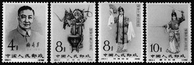1962年發(fā)行的“梅蘭芳舞臺(tái)藝術(shù)”紀(jì)念郵票共8枚,除第一枚4分的圖案為梅蘭芳像外,其余7枚都選用梅蘭芳生前不同時(shí)期在舞臺(tái)上塑造的具有代表性的藝術(shù)形象為圖案。 “梅蘭芳舞臺(tái)藝術(shù)”紀(jì)念郵票中的4枚(自左至右):第一枚4分,圖為梅蘭芳像;第二枚8分,“抗金兵”里的梁紅玉;第三枚8分,“游園驚夢(mèng)”里的杜麗娘;第四枚10分,“霸王別姬”里的虞姬。新華社發(fā)