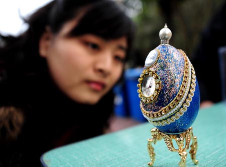 春節(jié)期間,中國科學(xué)院武漢植物園推出系列民俗活動,游客在武漢植物園里除了能欣賞奇花異草外,還能觀賞剪紙、面塑等傳統(tǒng)的手工藝以及新穎的蛋雕工藝品,一些游客在驚嘆這些精雕細刻的工藝品同時,還購買一些手工藝品回家收藏。圖為一位女孩被鵝蛋制作的首飾盒吸引。