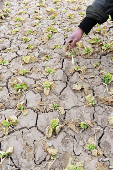 入冬以來我國北方地區(qū)遭遇嚴(yán)重干旱。據(jù)農(nóng)業(yè)部統(tǒng)計,河南省近六成的麥田受旱,有360多萬畝出現(xiàn)黃苗,有40多萬畝出現(xiàn)枯苗死苗現(xiàn)象;安徽省近七成的麥田受旱,有90萬畝出現(xiàn)點片死苗現(xiàn)象;山東、山西、陜西、甘肅等省麥田受旱面積均超過一半。