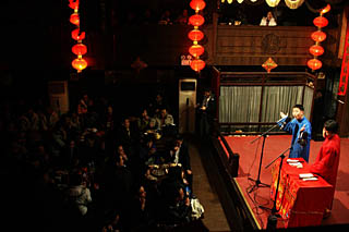 “嘻哈包袱鋪”的陣地駐扎在北京鼓樓大街廣茗閣茶樓,每周三、四、五的晚上和周六的下午,“嘻哈包袱鋪”都會在這里進行相聲表演。 “我們的團體是去年5月份成立并開始正式演出的,剛開始的幾個月,來聽我們相聲的人并不多,但是慢慢的,也許是大家口口相傳,來聽相聲的人越來越多!薄鞍や仭钡摹罢乒瘛,也是其創(chuàng)始人的高曉攀對記者說。目前,“嘻哈包袱鋪”已是京城最為火暴的相聲表演團體之一,極富時代感的表演特色、每張20元的低票價(相聲劇30元),使最多能裝下220人的廣茗閣茶樓幾乎場場爆滿。 2月12日對于“嘻哈包袱鋪”的演員們來說是個極為普通的演出日。接近傍晚時分,天空下起了中雨,但廣茗閣不論樓上樓下依然坐滿了人!拔沂菑木W(wǎng)絡(luò)上聽說這個團體的,上周五下午特意趕來買票,沒想到來的時候售票處已經(jīng)排了挺長的隊,這周茶座的票都賣光了,我排了半天也只買到了加座。”和朋友特意趕來觀看相聲的陳小姐對記者說,“這還是我第一次進茶館看相聲呢,以前都是在電視上看的! “我和女朋友兩個人也是從朋友那兒知道這個‘嘻哈包袱鋪’的,上周來買票沒買到,看到今天下雨,心想沒準(zhǔn)有人來不了退票,就在門口等,沒想到還真讓我等到了兩張,真幸運!瘪R先生略帶興奮地說。 記者觀察到,來聽嘻哈相聲的多是年輕人,不僅有“80后”,更有“90后”,“來聽我們相聲的年輕人居多,還有一部分是家長帶著孩子來的,從他們的反應(yīng)來看,他們也非常喜歡和理解我們這種說相聲的方式!备邥耘收f。 記者注意到,也有一些年紀(jì)稍大些的觀眾來給“80后”相聲捧場,他們多半是傳統(tǒng)相聲的忠實擁躉。齊先生就是其中一位,“我特別喜歡聽相聲,郭德綱沒火的時候我就在德云社聽,聽朋友說這個也挺有意思,就來看看!