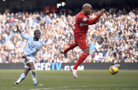 2008/2009賽季英格蘭超級聯(lián)賽第25輪,曼城隊主場1:0力克米德爾斯堡隊。圖為曼城隊球員肖·菲利普斯(左)起腳射門瞬間。