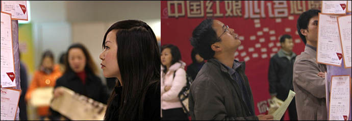 2月21日,中國紅娘(首屆)網(wǎng)絡(luò)交友節(jié)在杭州舉辦,活動當(dāng)天吸引了不少單身男女。舉辦方“中國紅娘”網(wǎng)站為參加活動的單身男女策劃了各種活動和游戲,為他們提供相互了解、接觸的平臺。參加活動的以30歲左右單身男女居多,且多為上班族。有人抱著放松心情的目的,也有人來碰碰運氣,還有人懷著美好的愿望,希望找到自己的另一半。 活動開始后,有些人比較靦腆,不是在桌子旁干坐著,就是跑到后面去看墻上貼的別人的信息。在現(xiàn)場音樂以及主持人的帶動下,一些人逐漸放開了自己,加入到活動中來。在傳遞愛心的活動中,一位男士還在臺上引吭高歌,另一個游戲則要求男士只能動嘴巴和眼睛,由女士喂他們吃東西,這也吸引了好幾組人參加,現(xiàn)場笑聲不斷。不太愛說話的盛先生這次也有所收獲,他要到了幾位女士的聯(lián)系方式,準(zhǔn)備活動后聯(lián)系。 三十來歲的阿戴,是中國紅娘網(wǎng)的注冊會員,聽說要舉辦網(wǎng)絡(luò)相親會,她也來到現(xiàn)場,準(zhǔn)備找一個跟自己學(xué)歷、年齡、背景相當(dāng)?shù)娜,可是今天她并沒有找到自己心儀的人,準(zhǔn)備繼續(xù)留意網(wǎng)上的信息。 從事外貿(mào)行業(yè)的謝先生,第一次參加這樣的網(wǎng)絡(luò)相親會,不過他對網(wǎng)絡(luò)交友可不陌生,他經(jīng)常在網(wǎng)上發(fā)布資料結(jié)交朋友。