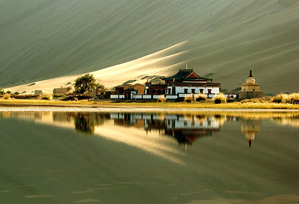 位于巴丹吉林沙漠深處的廟海子,又名蘇敏吉林海子,是沙漠腹地最美麗的景點(diǎn)之一,吸引眾多國(guó)內(nèi)外攝影師前來采風(fēng)。 廟海子被3座大沙山包圍,湖邊還有大片的平地,盡管只住著3戶人家,但巴丹吉林嘎查(村委會(huì))的駐地就在這里。 廟海子因湖畔有一座藏傳佛教寺廟而得名,寺廟院落不大,剛剛修葺過,正殿墻面白、紅、黃色相間,彩瓦飛檐,雕梁畫棟,墻壁上繪滿了佛教壁畫,藏經(jīng)閣里擺放著很多布裹的經(jīng)書,廟里燃著酥油燈和香,莊嚴(yán)肅穆。 巴丹吉林廟建有一人多高的圍墻,臨近湖邊矗立著一座白塔。廟后緊挨一座高大的沙峰,旁邊生長(zhǎng)著高大的白楊和柳樹。 臨近黃昏,夕陽(yáng)灑在沙山和湖面上,水面映出寺廟、沙山和樹木的倒影,海子邊居民喂養(yǎng)的山羊和鴨子隨意而悠閑。 據(jù)記者了解,廟海子旁的寺廟名為巴丹吉林廟,建于1775年,正殿建筑分上下兩層,面積近300平方米。 年輕的喇嘛哈斯烏力吉說,相傳建設(shè)寺廟時(shí),一磚一瓦、一石一木都是靠人力背運(yùn)及牦牛和羊群馱運(yùn),費(fèi)盡了艱辛。 還有一件神奇之事,廟海子邊上有幾眼“靈泉”,叫“聽經(jīng)泉”。其中岸邊的一眼泉水出水處大若碗口,廟海子里還有更大的泉眼,噴涌而出的水花比兩三個(gè)臉盆還要大。 海子邊的居民告訴記者,當(dāng)旁人高聲呼喊或使勁跺腳時(shí),廟海子的泉眼會(huì)更猛烈地噴涌,聲音過后又會(huì)恢復(fù)原樣,頗為神奇。 一些居民說,昔日廟內(nèi)喇嘛眾多,每當(dāng)喇嘛高聲誦經(jīng),海子里的泉水就會(huì)泛起成片成片的水花,“聽經(jīng)泉”由此得名。 |