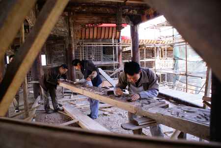 3月16日,略陽(yáng)縣紫云宮古建筑群保護(hù)維修工程施工現(xiàn)場(chǎng),3位雕刻工人正在進(jìn)行木刻修復(fù)。 陜西省略陽(yáng)縣境內(nèi)的紫云宮古建筑群是漢中市僅存的一處氐羌文化遺址。“5·12”汶川特大地震中,這座占地約1200平方米,始建于清代的羌族建筑嚴(yán)重受損,房屋主體明顯傾斜。陜西有關(guān)部門(mén)投資200萬(wàn)元對(duì)紫云宮進(jìn)行維修,預(yù)計(jì)今年6月底完成木雕及土建修復(fù)工程,9月前彩繪完畢并對(duì)游人開(kāi)放。 |