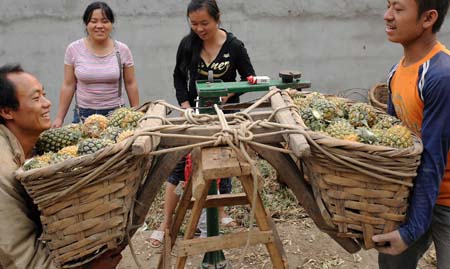 近年來,地處中越邊境的云南省河口瑤族自治縣的各族群眾加大優(yōu)質(zhì)高效農(nóng)業(yè)和特色農(nóng)業(yè)的開發(fā)力度,因地制宜種植香蕉、無(wú)眼菠蘿、芒果和西番蓮等熱帶、亞熱帶水果,并采用產(chǎn)供銷一體化的管理模式,實(shí)行產(chǎn)業(yè)化經(jīng)營(yíng),為當(dāng)?shù)剞r(nóng)民尋找到新的致富門路。如今菠蘿已是河口縣的拳頭產(chǎn)品之一,種植面積近10萬(wàn)畝,年產(chǎn)鮮果7萬(wàn)多噸。圖為幾名當(dāng)?shù)厝罕娫诘靥幹性竭吘车脑颇鲜『涌诂幾遄灾慰h將新鮮菠蘿過秤稱重,準(zhǔn)備運(yùn)往外省銷售。 |