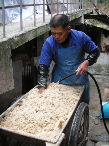 李永平用山泉攪拌天然飼料喂豬。 | 在美麗的楠溪江畔,養(yǎng)豬農(nóng)民老李響應(yīng)國(guó)家號(hào)召,多年艱辛,創(chuàng)出了浙江省惟一一家生豬養(yǎng)殖業(yè)的“綠色食品”品牌。然而時(shí)隔僅一年,由于申請(qǐng)不到屠宰證,“綠色屠宰”問(wèn)題難以解決,目前老李的豬場(chǎng)已瀕臨倒閉,辛辛苦苦創(chuàng)出的綠色品牌也將毀于一旦。