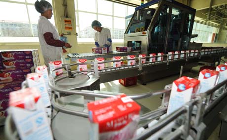 記者從近日召開的新疆穩(wěn)定奶業(yè)發(fā)展工作會議上獲悉,新疆決定2009年新安排8010萬元財政資金,重點用于推進(jìn)學(xué)生飲用奶計劃,實施乳品企業(yè)原料奶收購貸款貼息、奶粉儲備補助、乳品外銷儲運補貼。據(jù)了解,2008年10月以來,受國際金融危機(jī)和三鹿奶粉事件影響,新疆乳品企業(yè)積壓奶粉一度達(dá)到6000多噸。圖為新疆麥趣爾乳業(yè)有限公司包裝車間內(nèi),工人將生產(chǎn)出的袋裝奶裝箱。