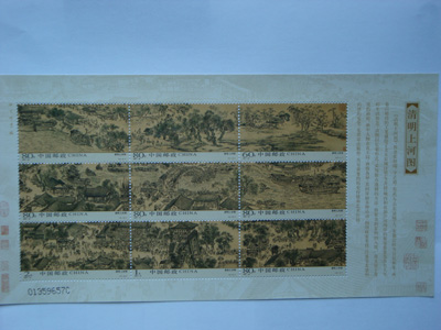 清明是我國(guó)的二十四節(jié)氣之一,也是我國(guó)的傳統(tǒng)節(jié)日之一,是拜祖和掃墓的日子。清明節(jié)又叫踏青節(jié)、寒食節(jié)。清明節(jié)始于周代,至今已有2500多年的歷史。2008年,國(guó)務(wù)院決定清明節(jié)為法定節(jié)日。 北宋時(shí)期,我國(guó)畫壇出現(xiàn)了一幅繪畫精品,它就是畫家張擇端創(chuàng)作的傳世之作《清明上河圖》,這幅畫畫幅浩大、藝術(shù)精湛,被人譽(yù)為“千古大觀、人間異寶”,現(xiàn)存北京故宮博物院。屬一級(jí)國(guó)寶。為了使這幅精品繪畫,讓更多的后人欣賞到,中國(guó)郵政在2004年10月18日將它搬上了方寸,發(fā)行《清明上河圖》郵票1套9枚(志號(hào)為2004-26) 《清明上河圖》原畫長(zhǎng)528.7厘米,全畫自右至左,大體分為三個(gè)部分:其一是寧?kù)o廣闊的鄉(xiāng)村、汴京郊外的春光;其二是繁忙的汴河漕運(yùn)碼頭;其三是繁華的都城汴京城,熱鬧的市區(qū)街道一角(今河南開(kāi)封)。畫面布局合理,有張有弛、有巰有密、有條有理、繁而不亂,充分展現(xiàn)了北京政和年間清明時(shí)節(jié)的一派繁榮升平景象。 這套郵票的設(shè)計(jì)和印刷很有特色,將5米多長(zhǎng)的長(zhǎng)卷壓縮在這套郵票中,惟一的辦法是選擇畫中的部分,以特寫鏡頭的手法,將郊野、漕運(yùn)和城市選切入郵票中,然后有序的排在一個(gè)小全(版)張上,而中間部分也是全畫的高潮部分,水陸交通、城鄉(xiāng)溝通放在郵票的正中地位,起到一目了然、以小見(jiàn)大的效果,具有較高的設(shè)計(jì)與印刷水平。