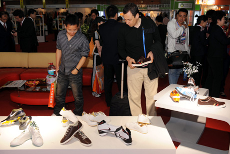 4月19日,海內(nèi)外客商在鞋類成品館參觀。 當(dāng)日,第十一屆中國(晉江)國際鞋業(yè)博覽會在福建省晉江市開幕。本屆鞋博會設(shè)立鞋機(jī)、鞋材、鞋類成品館三大展區(qū)和1350個國際標(biāo)準(zhǔn)展位,吸引來自16個國家和地區(qū)的海內(nèi)外專業(yè)買家前來洽談訂貨。