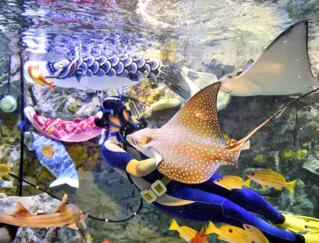 3日,在日本東京一家水族館,潛水員和魟魚嬉戲。她周圍掛著各種顏色的鯉魚旗,水族館用這種方式迎接兒童節(jié)。5日是日本的兒童節(jié),每逢這個(gè)時(shí)候,日本人都會(huì)在家門口升起鯉魚旗,祝愿孩子茁壯成長。新華社/法新