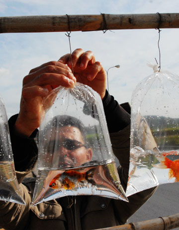 5月9日,在阿爾及利亞首都阿爾及爾街頭,一名攤主出售從中國進口的小金魚。近來,阿爾及爾街頭不少地方開始出售從中國進口的小金魚,水中游弋的小金魚為北非阿爾及爾增添了一絲清涼和趣意,受到當?shù)鼐用竦南矏邸P氯A社記者