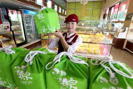 5月11日,店員展示用無(wú)紡布制作的環(huán)保粽子禮品袋。 端午節(jié)即將到來(lái),浙江省瑞安市一家食品公司推出一種可重復(fù)利用的無(wú)紡布環(huán)保禮品袋,供人們?cè)谄穱L傳統(tǒng)食品的同時(shí)增添環(huán)保意識(shí)。新華社發(fā)