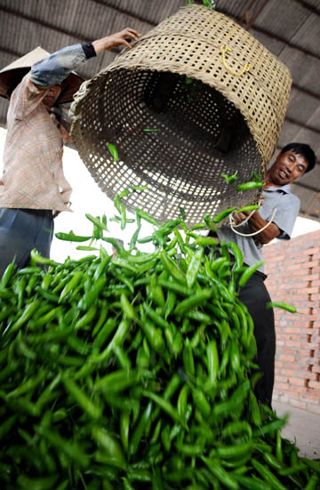 5月14日,欽州市那麗鎮(zhèn)農(nóng)民在幫助收購(gòu)商儲(chǔ)放辣椒。 2008年以來,廣西欽州市農(nóng)民大力發(fā)展“避雨、避寒、避曬”的“三避”技術(shù)栽培辣椒獲得成功。今年種植的七萬(wàn)多畝辣椒,預(yù)計(jì)產(chǎn)量達(dá)11萬(wàn)噸,產(chǎn)值近三億元。目前已收獲的辣椒正通過各種途徑銷往全國(guó)各地。