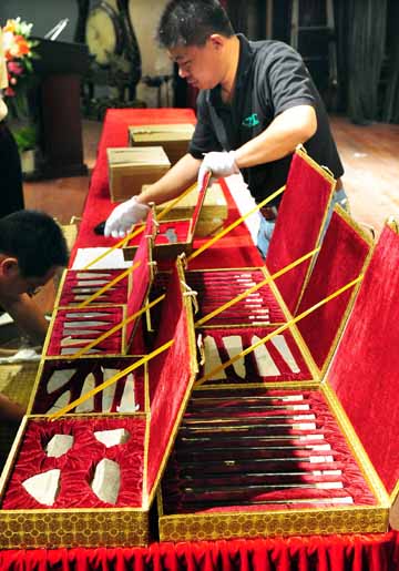 7月14日,工作人員在清點(diǎn)準(zhǔn)備移交中國文字博物館的珍貴文物。 當(dāng)日,河南省征調(diào)文物入藏中國文字博物館儀式在河南省博物院舉行。193件有關(guān)文字的珍貴文物被移交中國文字博物館收藏。 這批移交的文物包括河南博物院院藏“十六年鄭令”戈、銅“部曲將”印、曾子甗等123件文物和河南省文物考古研究所所藏的賈湖龜腹甲刻符、新蔡葛陵楚墓竹簡、溫縣盟書、長子口鼎、薳子昃鼎、平夜君成戈、垂球等不同歷史時期的各門類文物70件。