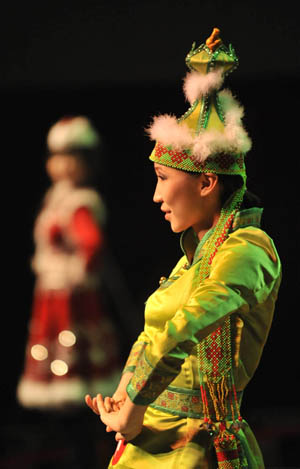 新疆維吾爾自治區(qū)的蒙古族模特在展示時(shí)尚的蒙古族服飾。