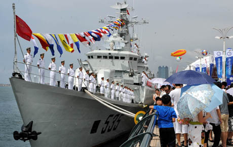 8月9日,觀眾在排隊(duì)參觀海軍艦艇。