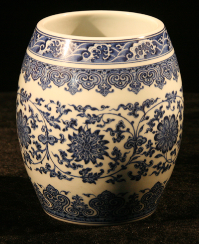 隨著2009年CCTV大型電視活動“華邦國際杯”《尋寶———走進鹽城》活動的圓滿結(jié)束,“清乾隆青花纏枝鼓式缸”(如圖)以絕對的優(yōu)勢毫無懸念地入圍了鹽城十大民間寶物。該藏品系陳設觀賞器,品相完好,器形端正,造型工整,花紋精細,技法老練,一看便知出自官窯手筆,再者,其白釉底色略含青灰,為清乾隆瓷器的典型色,純正厚實,沉郁幽靚,歷經(jīng)百年,浮光依稀,溫文爾雅,堪得林下耆英之風。