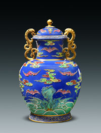 琺瑯粉彩壽山福海雙龍耳蓋瓶。 | 本報(bào)訊