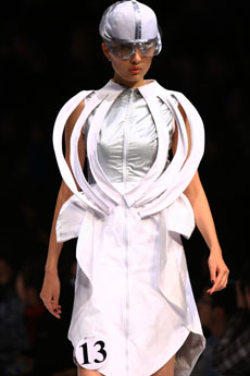解讀:透過來自全國25所國內(nèi)知名服裝院校的27份作品,在愛慕2009全國高校女裝設計邀請賽上,年輕設計師們演繹了各自對于時尚的獨特理解。 夸張局部造型突出腰身,使作品極具未來主義色彩;利用簡潔的黑白為主色調(diào),清晰而現(xiàn)代;通過面料的二次創(chuàng)作以及輔料上的對比,表現(xiàn)出一動一靜,表達變化與統(tǒng)一的協(xié)調(diào)……最終,東北電力學院藝術學院的劉振憑借作品《迷戀》勝出。