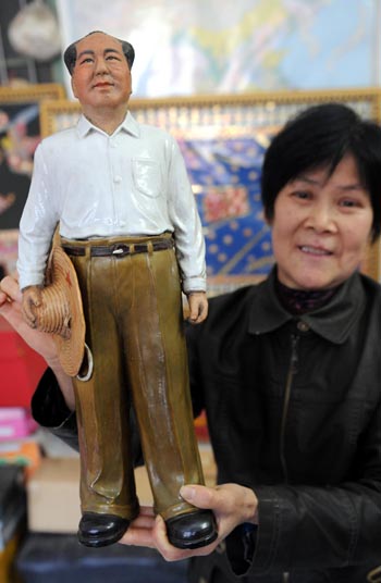 圖為黃瑛在展示收藏的毛澤東瓷像。 |