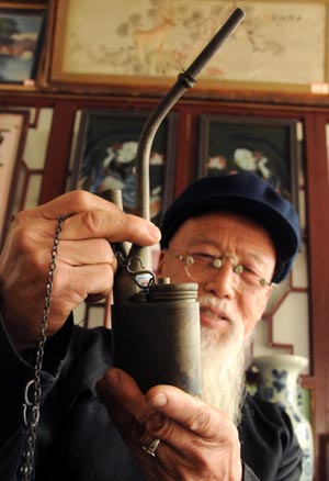 3月21日,在河北永清縣李莊子村,李贏老人正在把玩他收藏的一個(gè)水煙壺。李贏是河北省永清縣李莊子村一名普通農(nóng)民,他花費(fèi)幾十年時(shí)間收藏了涉及瓷器、陶器、銅器、木器等幾十類共4000多件藏品,并在自家庭院中建起了民俗博物館,吸引了鄉(xiāng)鄰和眾多外地游客前來(lái)參觀。