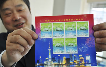 蘇州郵政局工作人員展示《中國2010年上海世博會開幕紀念》郵票的小本票。新華社發(fā)(朱桂根/攝) |
