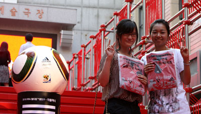 韓國到處可見世界杯相關宣傳,世界杯氣氛日漸濃郁。韓國首爾著名商業(yè)街明洞日前還舉行抽獎領韓國國家隊隊服活動,圖為兩個女孩展示領到的韓國國家隊隊服,興奮之情溢于言表。記者 何璐璐/首爾報道