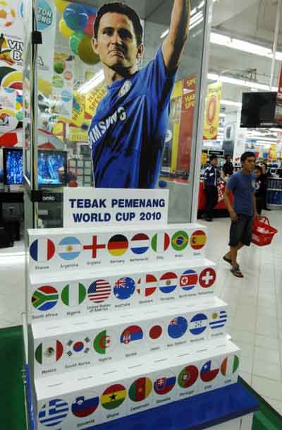 為迎接2010年南非世界杯,印度尼西亞首都雅加達眾多商場內(nèi)的體育用品店打出“世界杯”經(jīng)濟牌,吸引球迷購買有關足球的用品。圖為雅加達一家商場內(nèi),一名顧客從競猜世界杯冠軍的投票箱旁經(jīng)過。記者 岳月偉/雅加達報道
