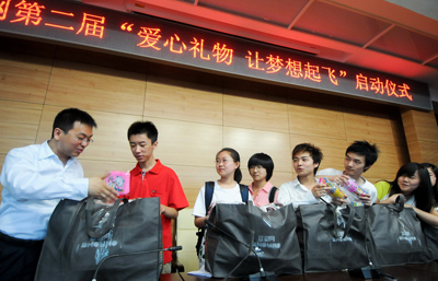 2010年6月26日,互邀網(wǎng)產(chǎn)品總監(jiān)王權(quán)武(左)將捐贈禮物交給大學生志愿者代表。當天,由互邀網(wǎng)主辦的第二屆“愛心禮物,讓夢想起飛”活動啟動儀式在北京舉行。此次活動以“愛心禮物,讓夢想起飛”為主題,將由百余名大學生志愿者,利用暑假回家的時機,把捐贈的禮物帶給全國100余所希望小學。