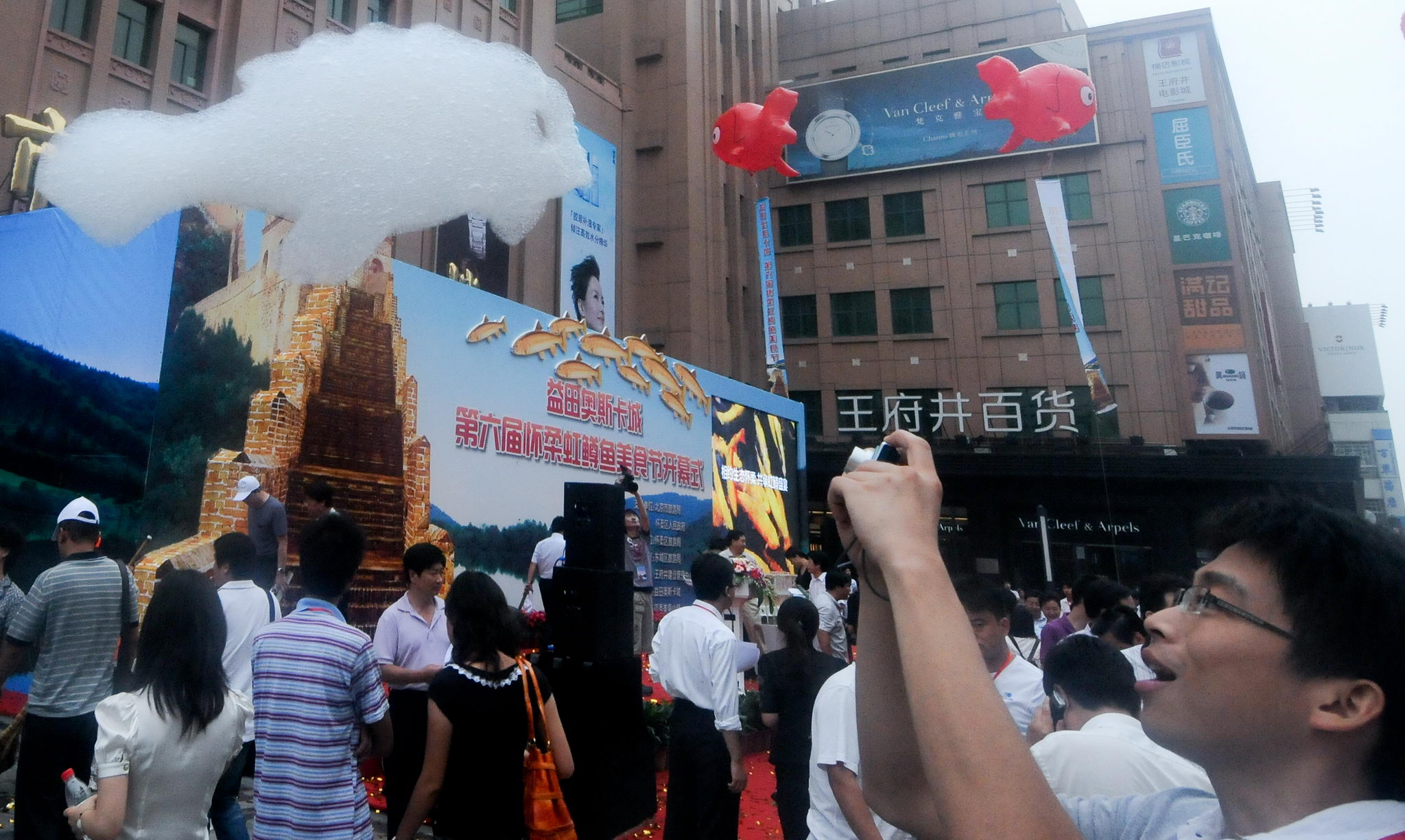 2010年7月13日,在北京王府井大街舉辦的懷柔區(qū)第六屆虹鱒魚美食節(jié)開幕式上,一名觀眾在給一個(gè)“氣泡魚”拍照。為給儀式助興,工作人員在現(xiàn)場(chǎng)用機(jī)器將氣泡制成魚的形狀,慢慢在空中升起,吸引了不少人觀看。