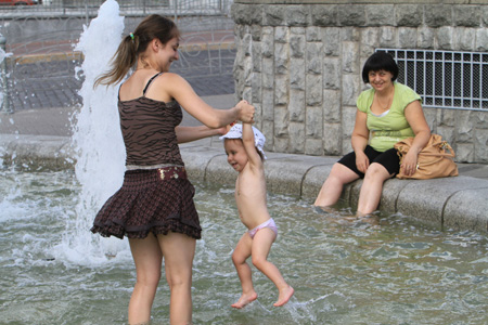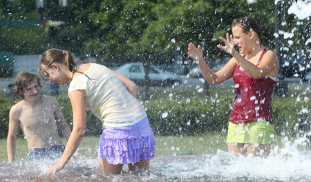 ▲6月下旬以來,莫斯科地區(qū)天氣一直干燥、炎熱,氣溫持續(xù)接近和超過30攝氏度,而莫斯科7月白天正常氣溫應(yīng)該在23攝氏度左右。氣象專家表示,莫斯科今夏或?qū)⒚媾R130年來最熱的夏天。圖為兩名女孩在俄羅斯首都莫斯科勝利廣場的噴泉中解暑。記者 魯金博/莫斯科報(bào)道