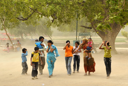 ▲近日,印度首都新德里遭遇高溫?fù)P塵天氣,42攝氏度的氣溫伴隨著大風(fēng)引起的揚(yáng)塵橫掃了整個(gè)城市,幾名行人在大風(fēng)揚(yáng)塵中掩面而行。記者